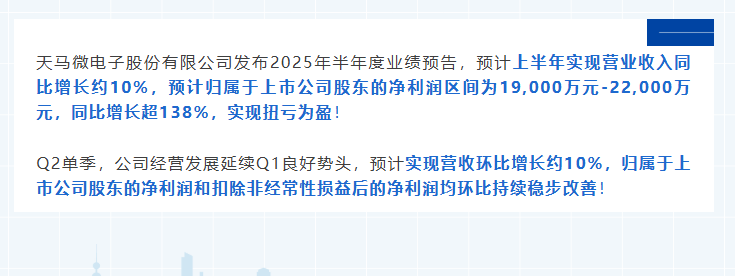 天馬微電子股份有限公司發(fā)布2025年半年度業(yè)績預告,預計上半年實現(xiàn)營業(yè)收入同比增長約10%,預計歸屬于上市公司股東的凈利潤區(qū)間為19,000萬元-22,000萬元,同比增長超138%,實現(xiàn)扭虧為盈!Q2